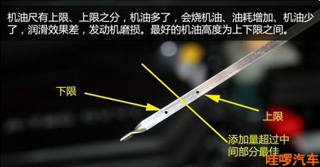在机油尺的末端有上限和下限的记号,观察被机油浸润的部分,如果在上下限之间,说明机油量正好,如果高于上限则说明机油量过多,低于下限则说明机油量过少,需要适量添加。